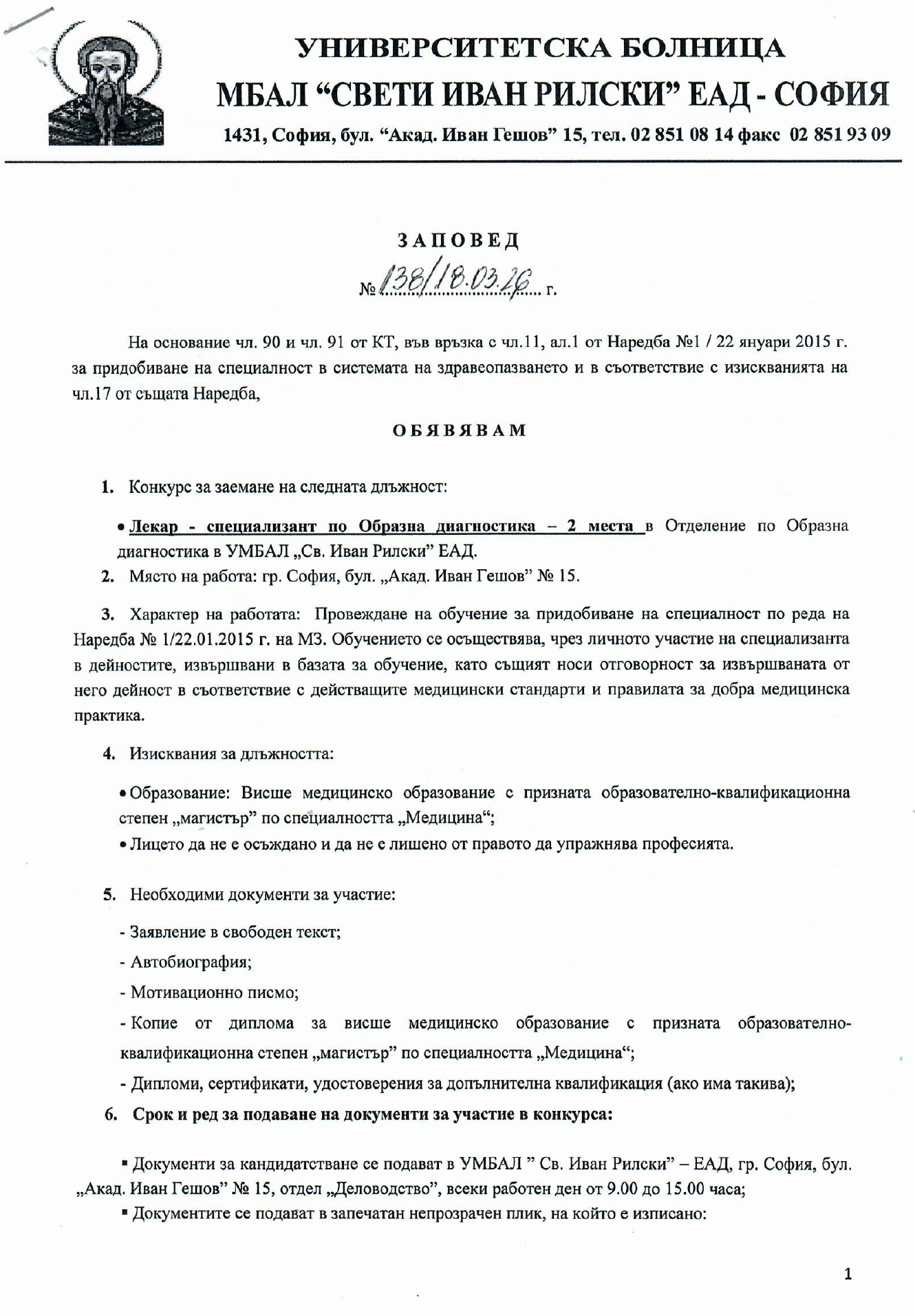 УМБАЛ “Св. Иван Рилски” ЕАД обявява: