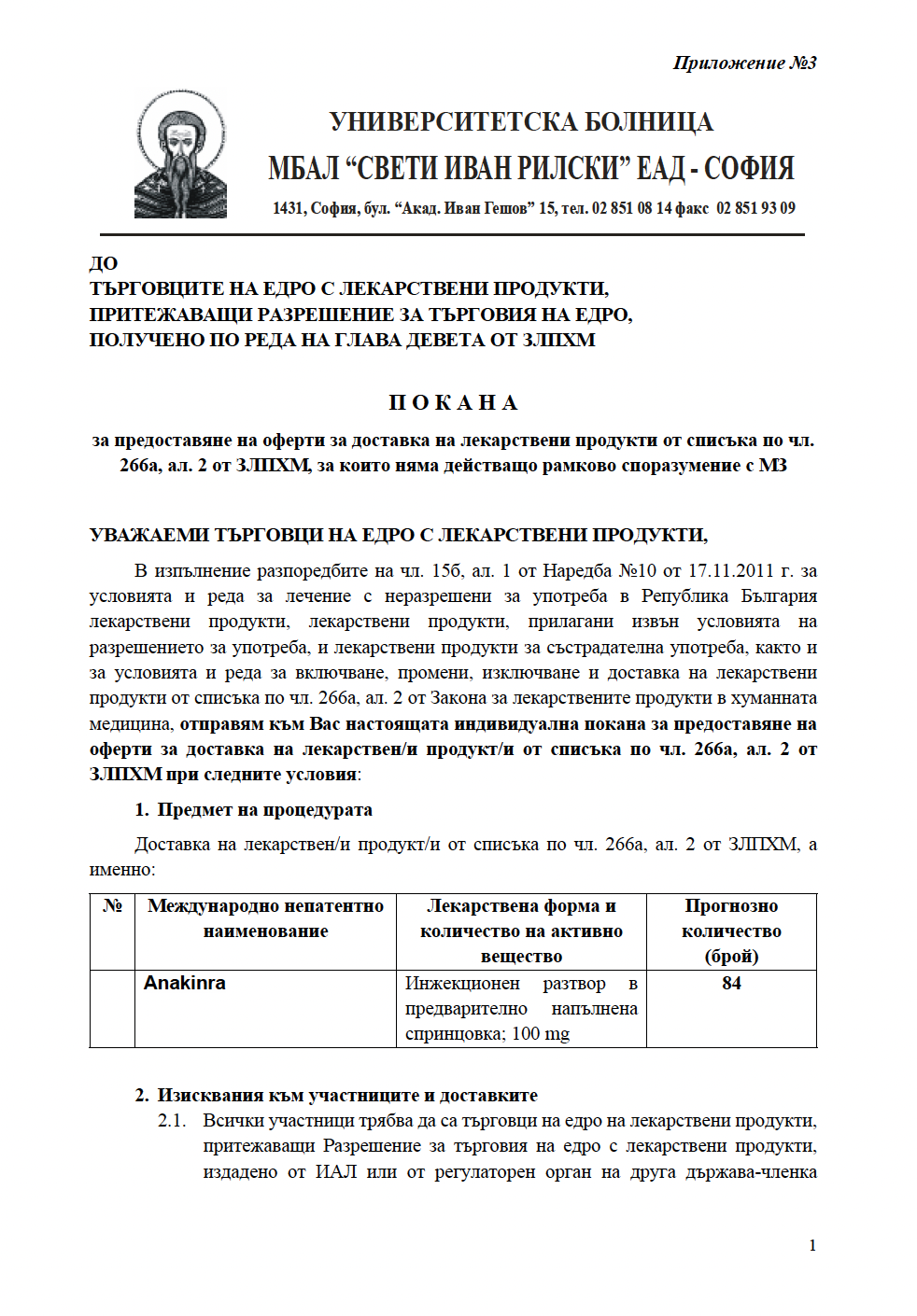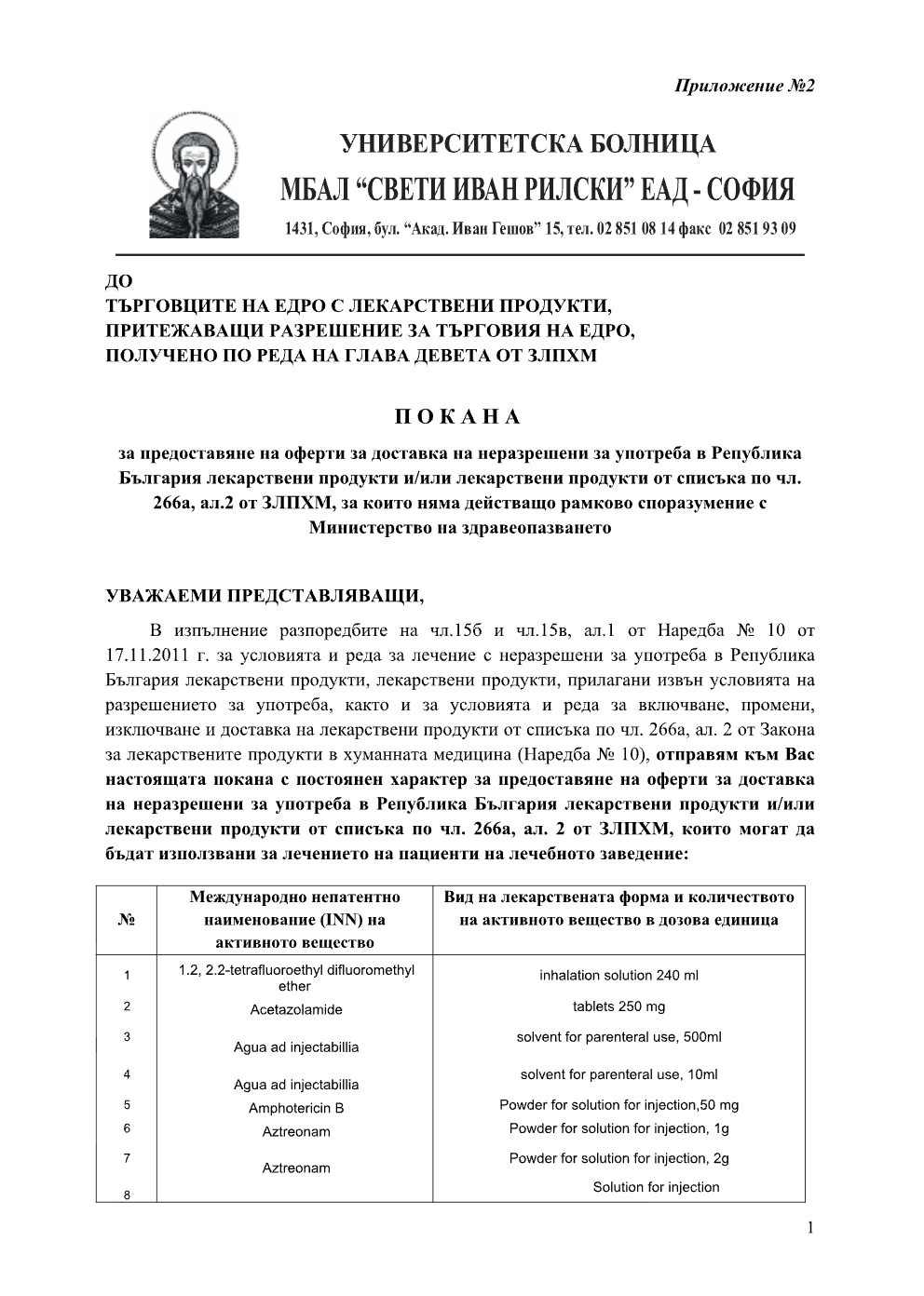 На основание чл.266а, ал.2 от ЗЛПХМ,за нуждите на УМБАЛ Свети Иван Рилски в рамките на 5/пет/работни дни приемаме оферти за посочените лекарствени продукти на