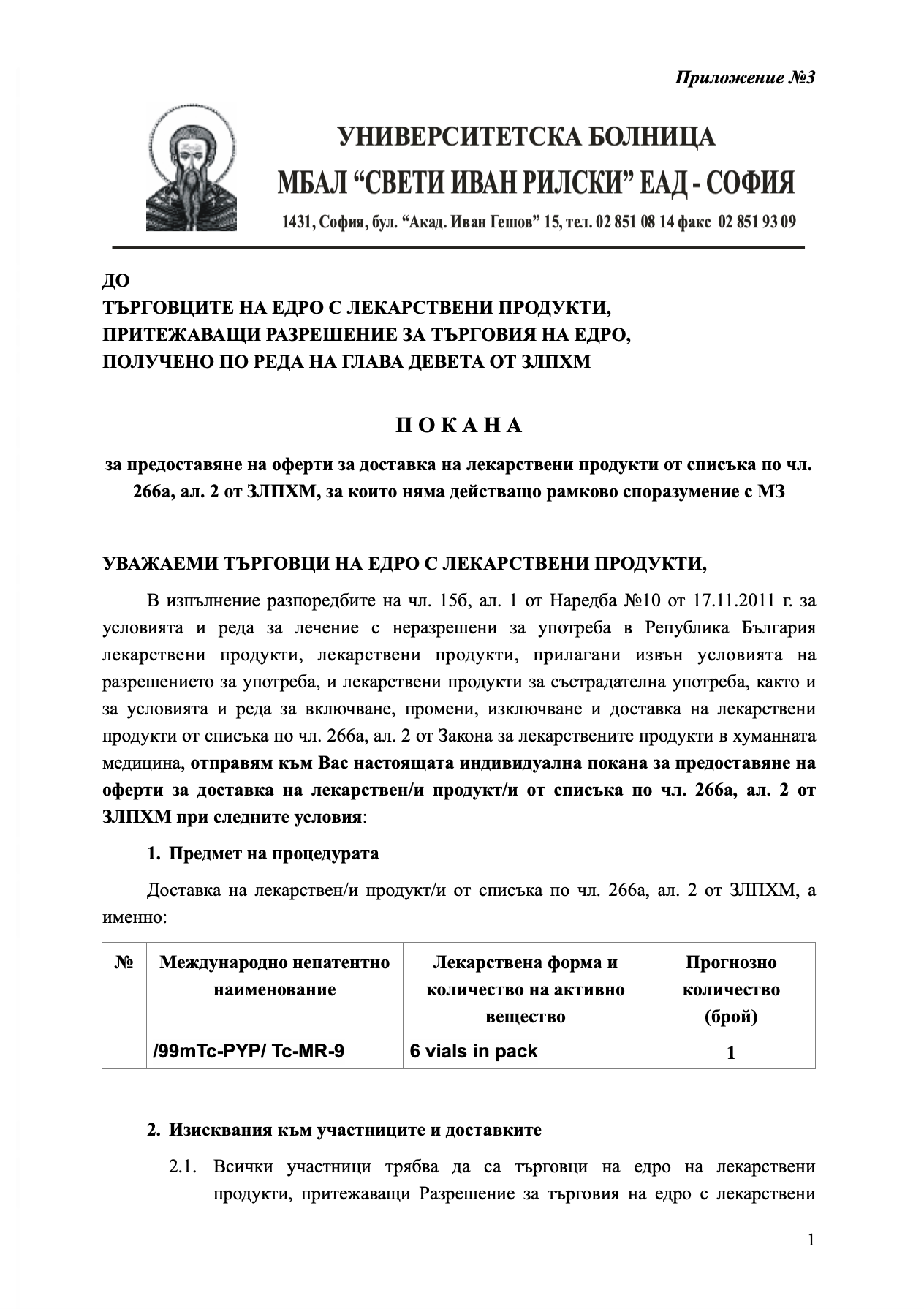 На основание чл.266а, ал.2 от ЗЛПХМ,за нуждите на УМБАЛ Свети Иван Рилски ЕАД